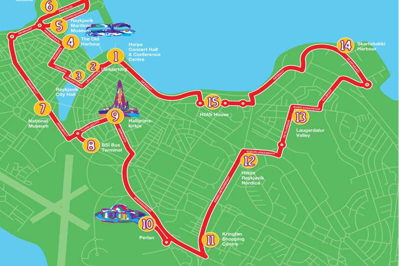 The City Sightseeing bus route has a single route which makes 15 stops at the main tourist attractions in Reykjavik. The full circuit takes 60 minutes, but you can hop on and hop off at any of the stops along the way to tailor your tour.